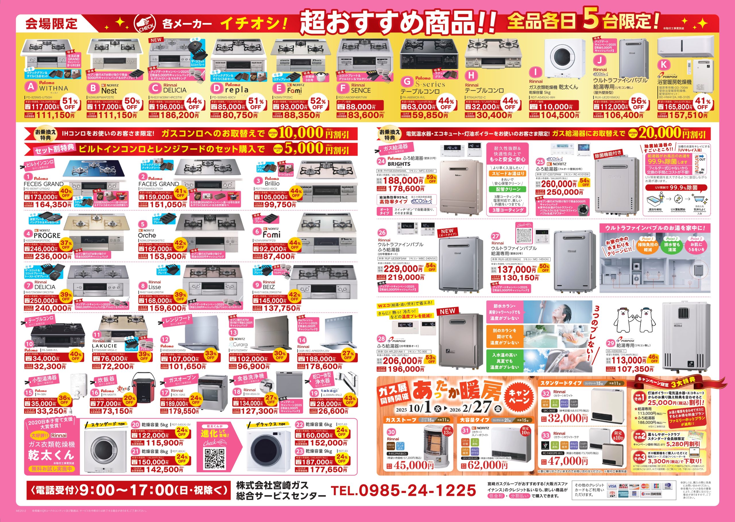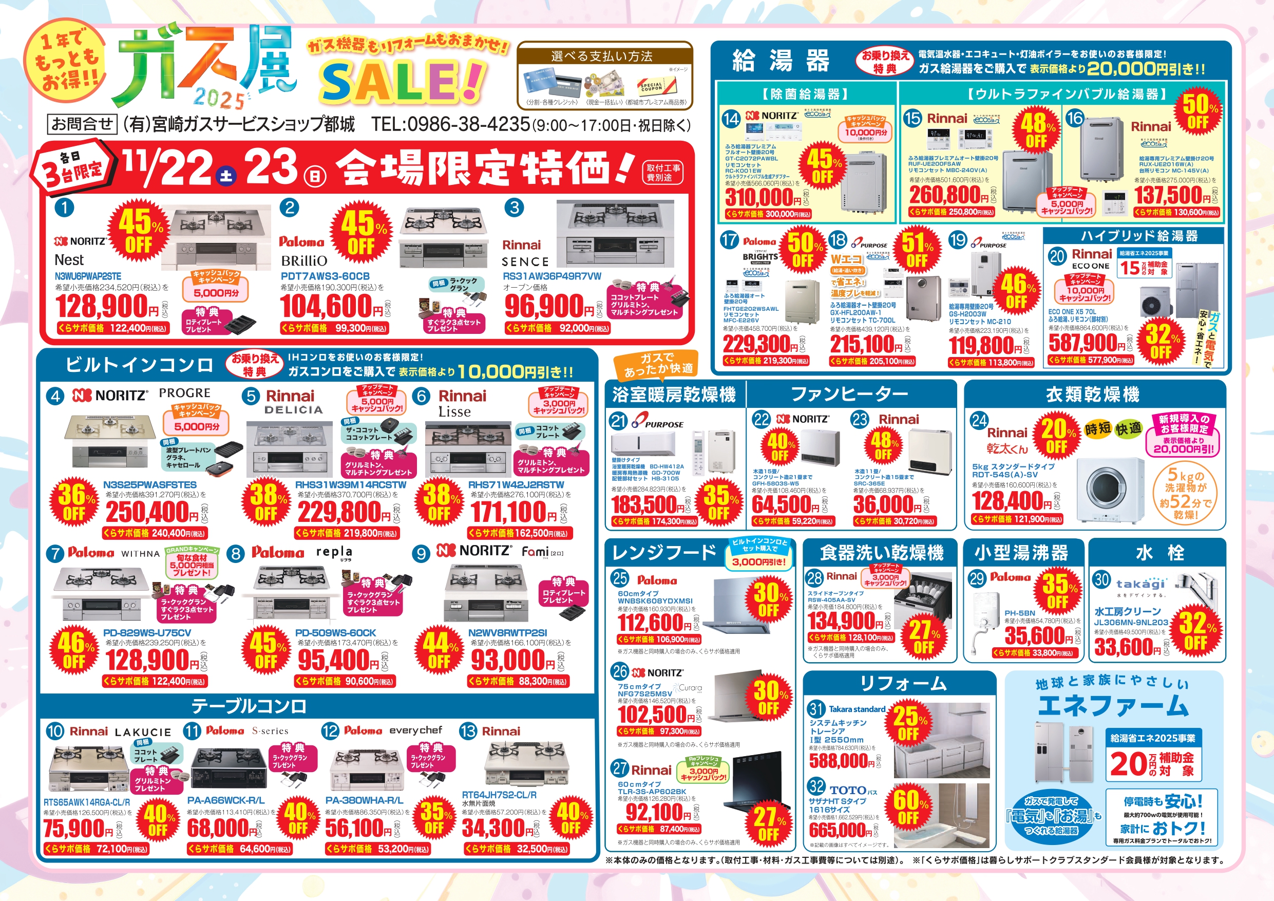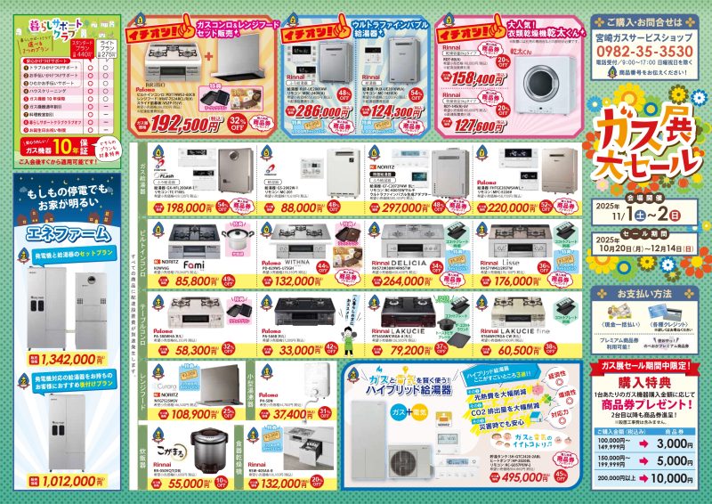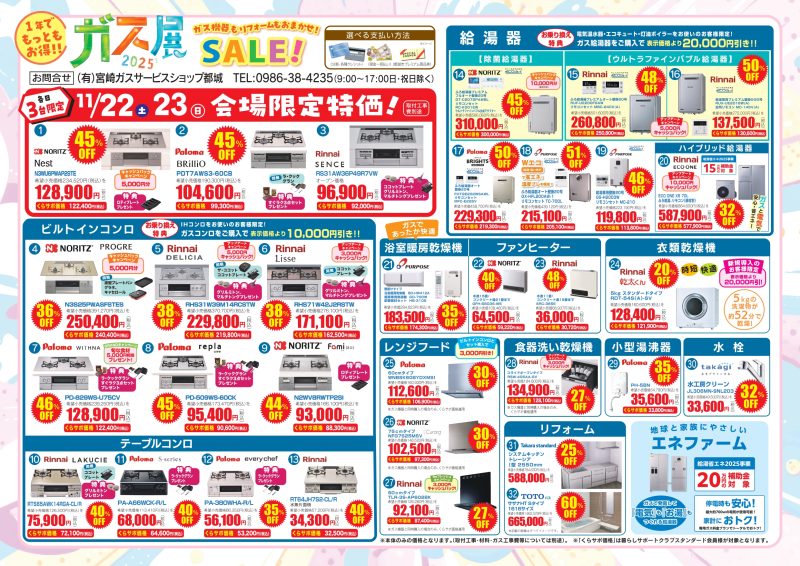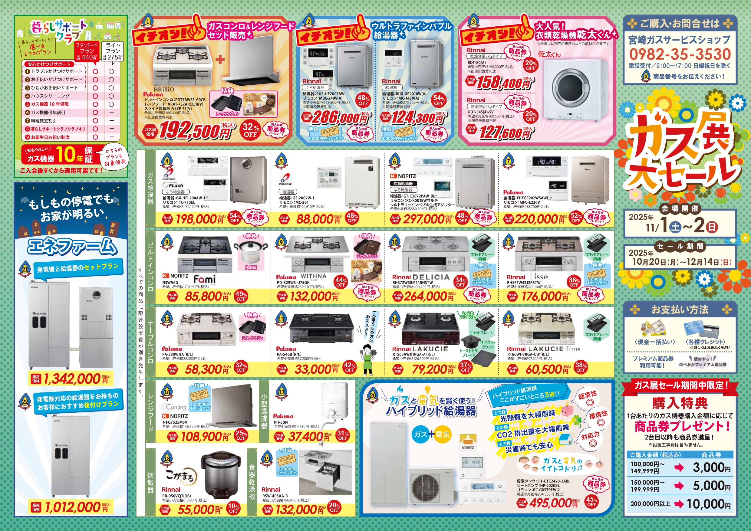 日頃より、宮崎液化ガスをご愛顧いただきましてありがとうございます。 毎年ご好評いただいております県内3会場のガス展につきまして、会場へ足をお運びいただき誠にありがとうございました。皆さまのお力添えを賜り、盛況のうちに開催できましたこと、深く感謝申し上げます。 引き続き、12/14(日)までガス展セールを開催しております。年に1度のお得なセールとなっておりますので、ガス器具の買替・新規購入をご検討されている皆さまはお気軽にご相談ください。